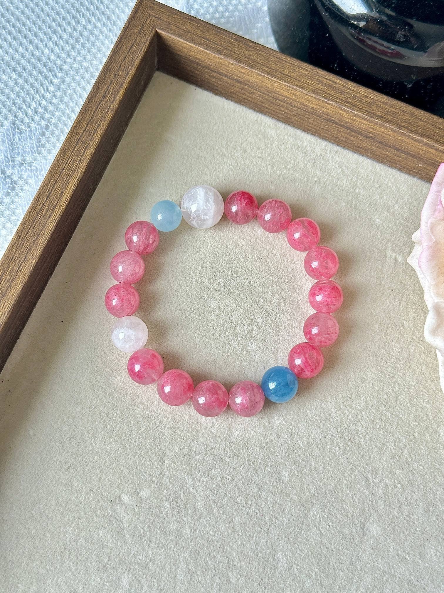 - Elegant bracelet combining thulite, aquamarine, and clear quartz