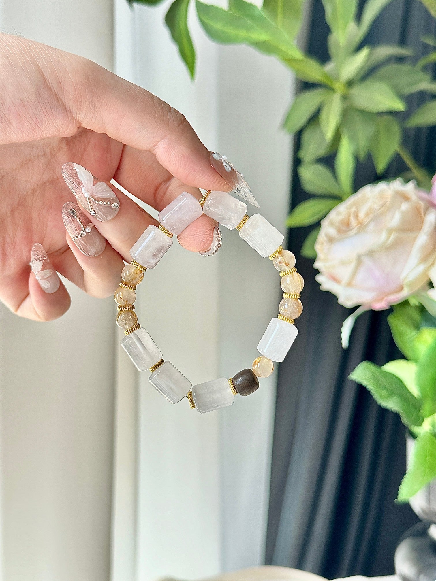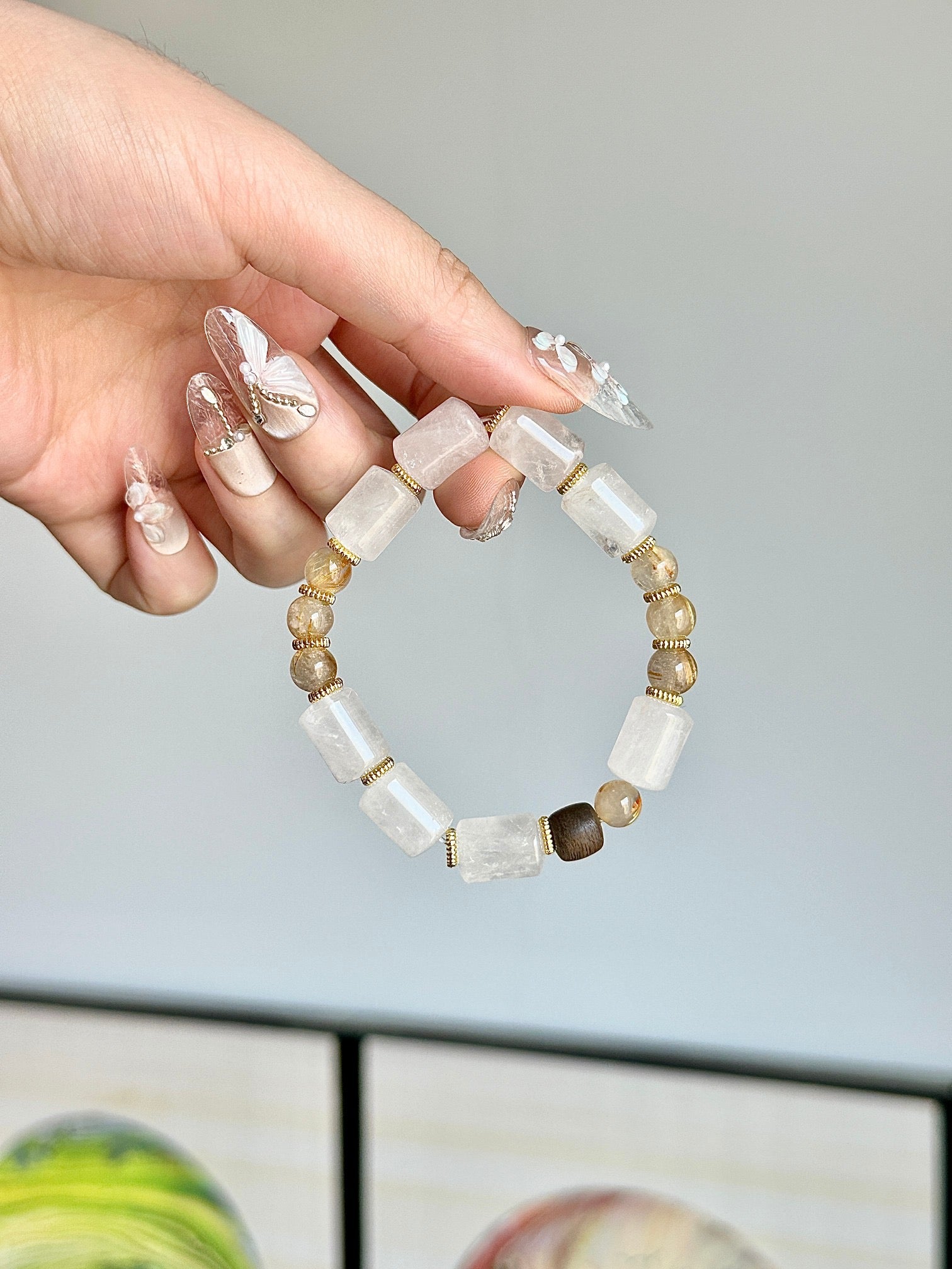 - Multi-material bracelet with white phantom barrel quartz, rutilated quartz, and wooden beads