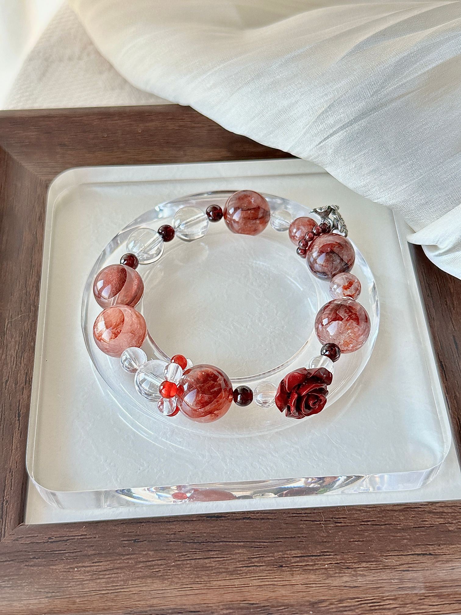 - Elegant bracelet featuring red resin flower quartz, clear quartz, and rose accents