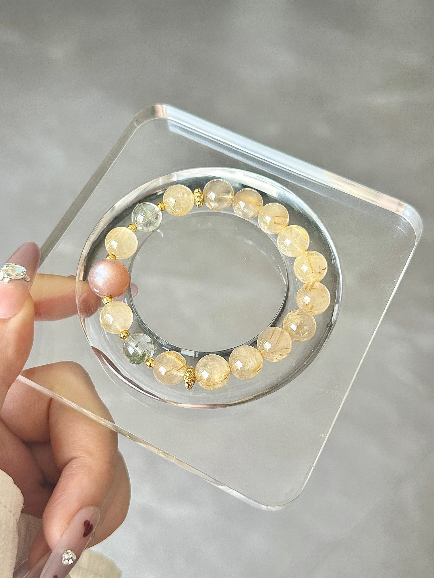 - Material: Rutilated quartz, Green phantom quartz, Sunstone