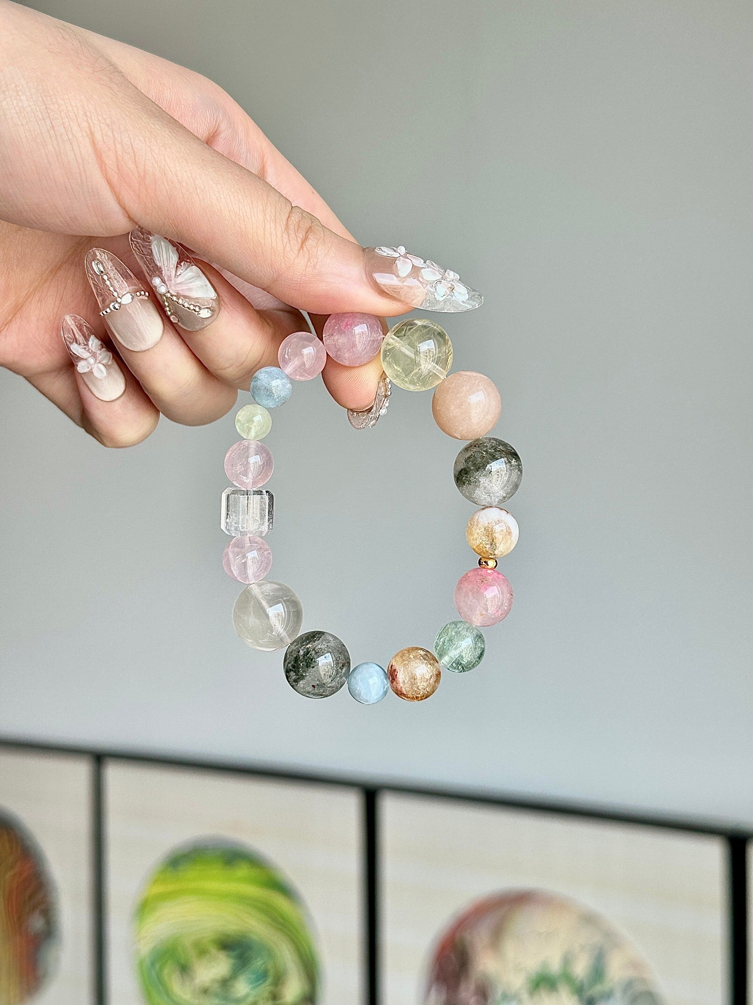 - Material: Green Phantom Quartz, Yellow Quartz, Aquamarine, Yellow Topaz, Cherry Blossom Stone, Rose Quartz